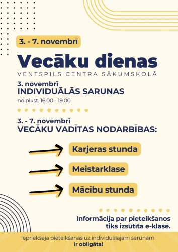 Tuvojoties 1. aprīlim, kad tiks uzsākta pieteikumu pieņemšana bērnu reģistrācijai 1. klasēs, Ventspils Centra sākumskola aicina piedalīties tiešsaistes pasākumos, lai iepazītos ar mūsu skolu, tās tradīcijām un kopīgās sarunās rastu atbildes uz neskaidrajiem jautājumiem. Jums būs iespēja uzdot jautājumus direktorei Liānai Biezbārdei, vietniecēm Ritai Vēverbrantei, Elīnai Klevinskai un Guntai Brensonei, kā arī 1.klašu audzinātājām Anitai Gailei un Intai Ozolai-Sūnai.